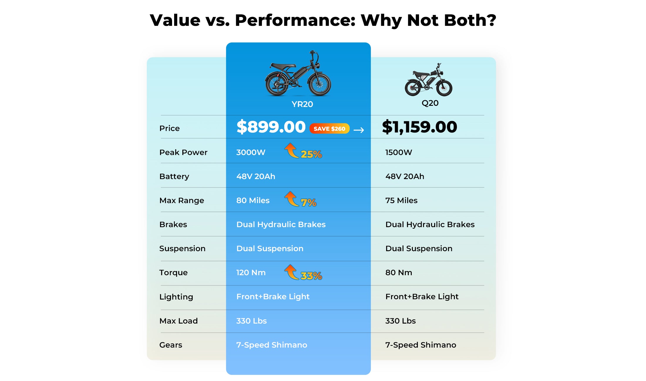 The YR20 features advanced front fork and rear shock absorbers, paired with a dual suspension system and 20” × 4” wide tires. This setup absorbs shocks and vibrations, supports up to 330 lbs, and ensures a smooth, safe ride on any terrain.
